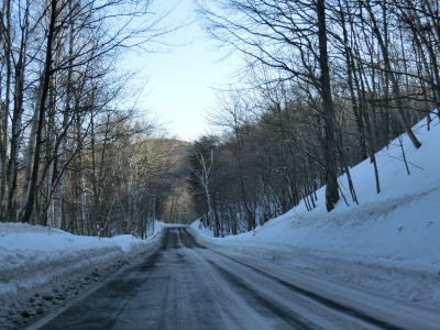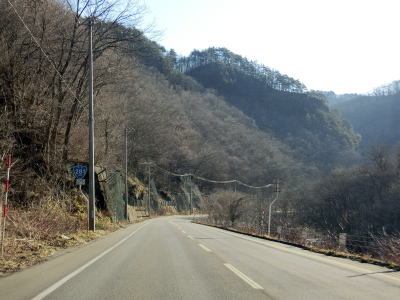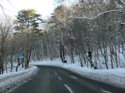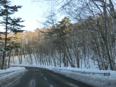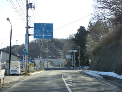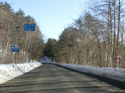 | 久慈市に入った直後から幅員が若干狭くなる。路側帯が狭くなった程度だが積雪期は雪壁との距離が短くなるためさらに狭く感じられる。峠を越えて北向きの斜面となるためか、葛巻町側よりも積雪が多く路面には残っている雪も見られた。 | ||