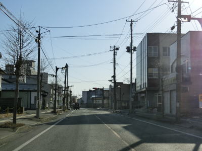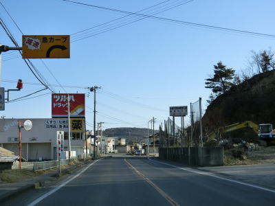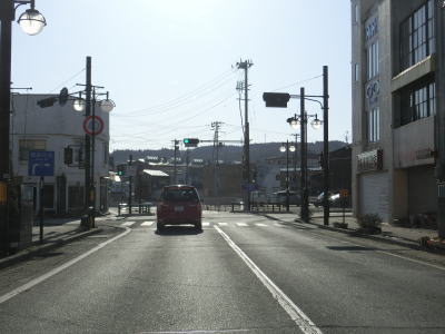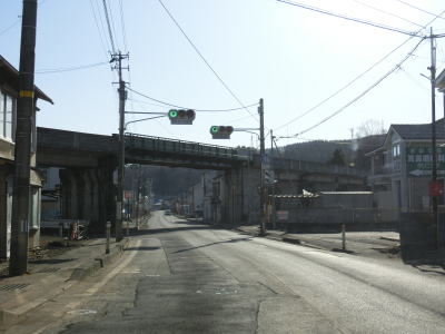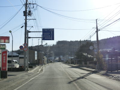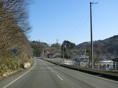 | 久慈市街地を含む平野部に入ってからは歩道付きの2車線道路になる。前後でS字状にカーブしている大川目橋を渡って久慈川の右岸に移るが、東詰には4.1km先から津波浸水想定区域になる旨の警告の標識が設置されている。これは2011年3月11日の東日本大震災後に設置されたものである事は言うまでもないだろう。 | ||