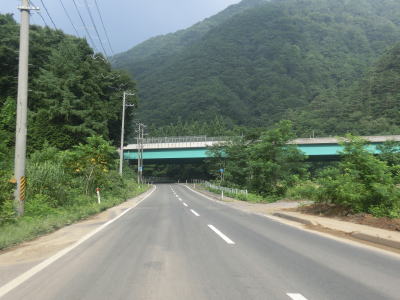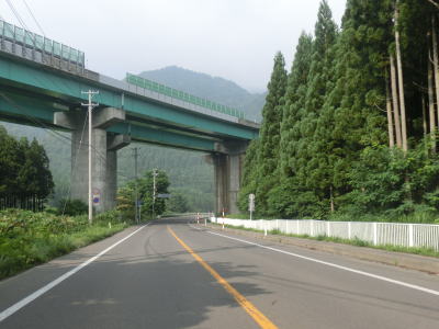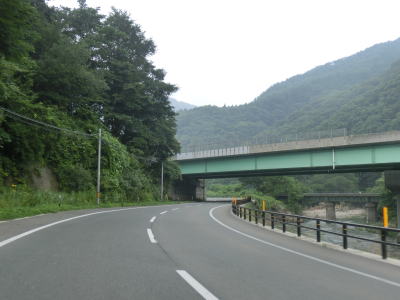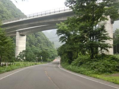 | 湯瀬温泉を抜けると蛇行する米代川に沿って進み、跨線橋を1ヶ所、東北道の橋梁の下を4ヶ所通る。東北道の天狗橋の少し南では上下線が分離するが、間にあるのは中央分離帯ではない。西向き(鹿角市街方面)車線は山肌にあり、東向き(八幡平方面)は橋梁となっている。地形が悪い等の理由で普通の拡幅ができなかったのだろう。 | ||