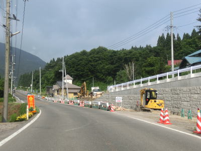 | 意外に高い建物もある湯瀬温泉では拡幅工事が行われており片側交互通行規制が敷かれていた。その工事現場の先にはバイパス工事現場が隣接しており、家屋が密集し急カーブが多い区間はバイパスの開通後に国道から降格するものと思われる。バイパス区間の距離はさほど長くなく集落を出るまでに西側の接続箇所を通過する。 | ||