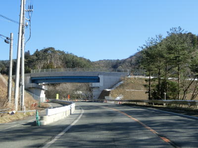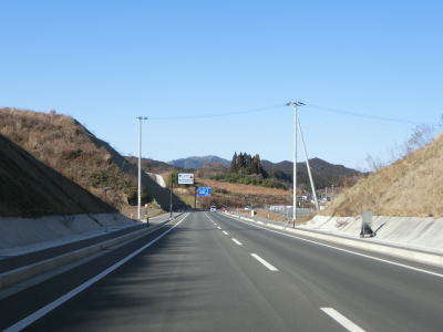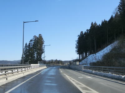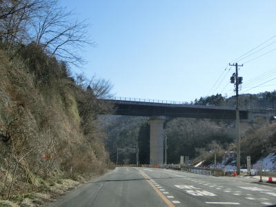 | 唐桑小原木ICから程なくしてひと休みパーキングの前を通過する。トイレも自販機もないただの少し広い駐車帯だが、海岸線の崖の上にあり東の方角の眺望が良い。緩やかな勾配を下っていると津波浸水区間に入り、青野沢川に架かる橋を渡る。橋が嵩上げされているため前後はやや急な勾配となっている。 | ||