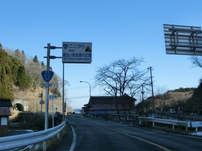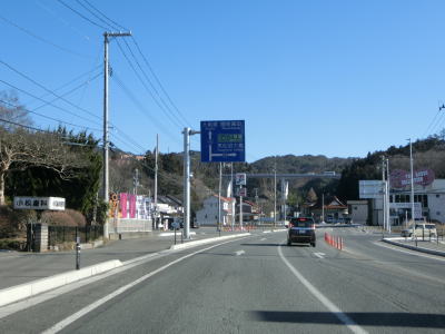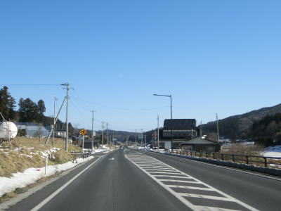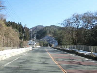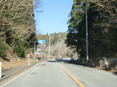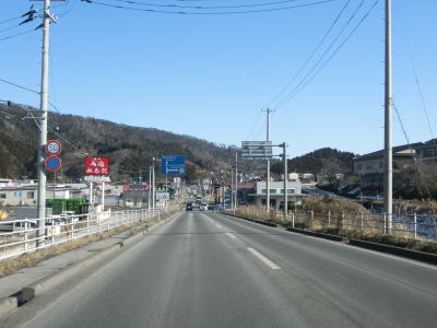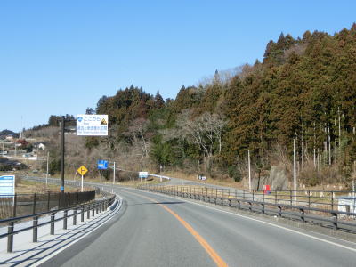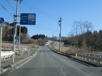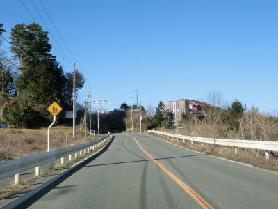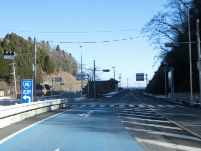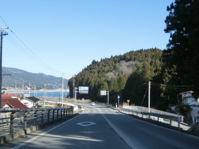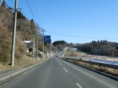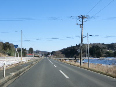 | 緩やかな勾配を下っていると県境からさほど離れていない場所で最初の集落を通り抜ける。その後の緩やかな勾配を下っていると津波浸水区間に入るが、名称不明の小さな川を渡ると上り勾配に転じて津波浸水区間を出る。津波浸水区間の距離は300mに満たないが、起終点を示す標識は立てられている。 | ||