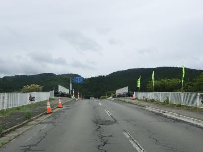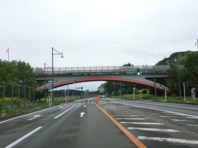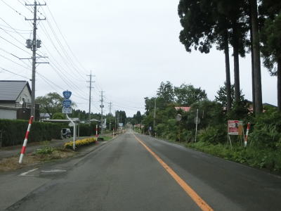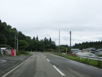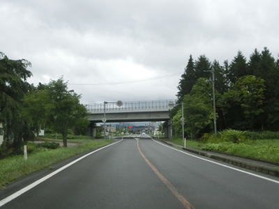| 道の駅を過ぎると緩やかな勾配を上ってJR花輪線の上を通ると下りに転ずる。跨線橋の前後にカラーコーンが並べられていたが、歩道工事に関するものと思われる。平坦になった所で秋田r52扇田交差点を通過して扇田大橋で米代川を渡る。 | ||