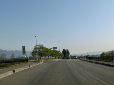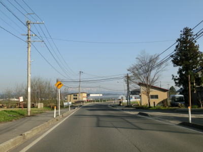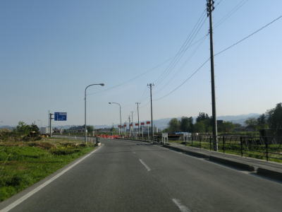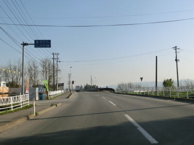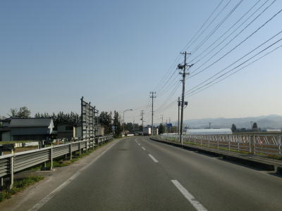 | 最上川の堤防の外側を走っていると旧道らしき道路との交差点を通過し、緩やかな勾配を上って少しだけ堤防上を走る。堤防の上には駐車帯が設置されている。堤防から離れると平坦な直線道路を走り、程なくして白鷹町に入る。 | ||