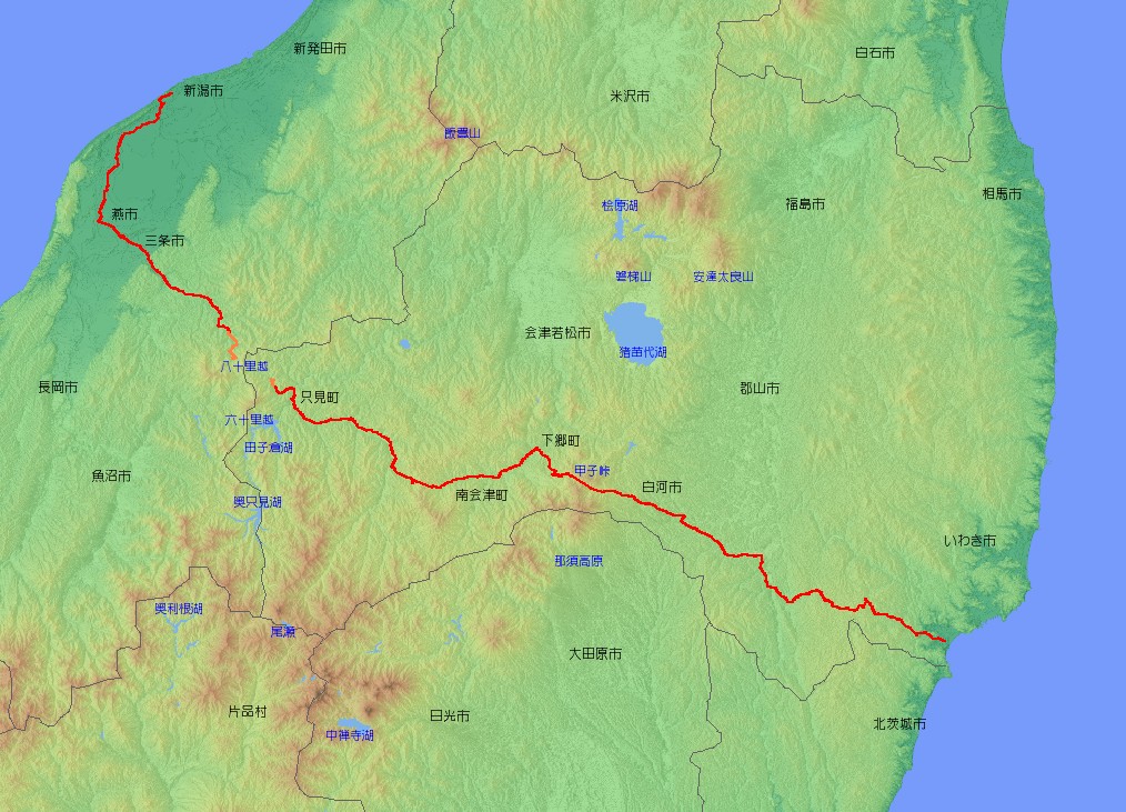 | 主な経由地 | 新潟県新潟市〜燕市〜三条市… …福島県只見町〜南会津町〜下郷町〜白河市〜棚倉町〜鮫川村〜いわき市 |