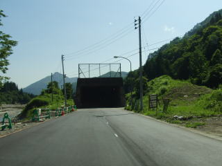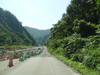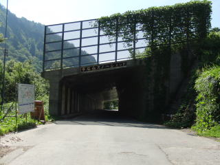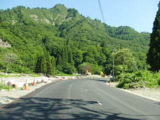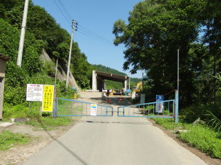| ゲートから振り返って只見町中心部方面を向くと平石山スノーシェッドがある。スノーシェッドの先は2.0車線と決して狭い訳ではないが、八十里越が開通した際は交通量の増加が予想される事から心許ない道路状況である。さらには入叶津川に接している場所において崩落が見られ片側交互通行規制を敷いて道路そのものよりもまず河川を補修していた。通行可能な山側も砂利である事から被災当時は完全に崩落していたのかもしれない。 | ||