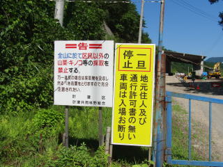 | 約100km、2時間の迂回を経て辿り着いた只見町側もゲートによって進路を妨げられる。ひっそりとしていて工事をしているかどうか分からなかった三条市側に比べて只見町側はゲートのすぐ先で工事をしているのが見える。ゲートの脇には小さなプレハブ小屋があり警備員の詰所として使われていた。工事をしている間は警備員が常駐しているのだろう。 三条市側は工事関係者以外の通行を禁じていたが、こちらは工事関係者に加えて地元住民と通行許可書がある車両は進入できるようだ。山菜やキノコを採取する事を禁止する旨の看板が立てられている事からそれらの採取や野良仕事のためにゲートより奥に入る必要がある人がいるのかもしれない。許可書については、「国道の走行レポートを書くためです」というのは通用しないだろうなぁ。 |