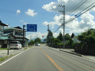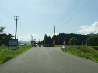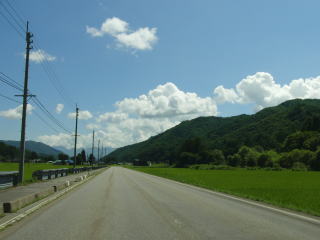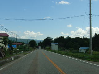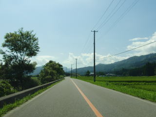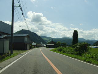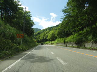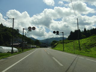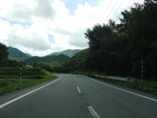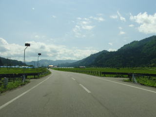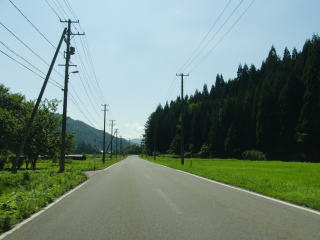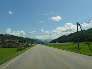 | スノーシェッドから先は水田が広がる長閑な風景の中を走り抜ける。歩道はなくセンターラインは消えかけているが、見通しの良い状態なので走りにくさは全く感じない。楢戸沢に架かる橋が付替え工事のため仮設橋の前後で急カーブとなっているので工事が終わるまでは減速して通過しなければならない。その架橋工事箇所の除けば伊南川沿いの集落を結ぶローカル快走路である。 | ||