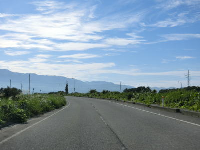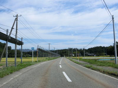| 新潟r142交差点を過ぎてからも平坦でカーブのほとんどない2車線道路が続いている。交通量が少ない事もあって非常に走りやすい。殿岡集落は比較的家屋が多いものの走りにくいと感じる程ではない。殿岡集落を過ぎると平坦な直線道路になる。 | ||