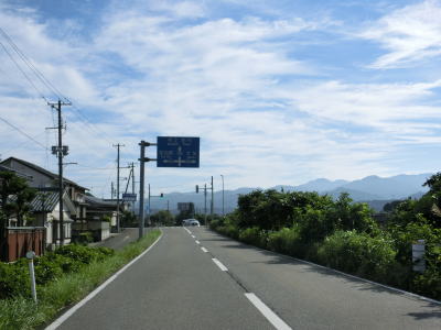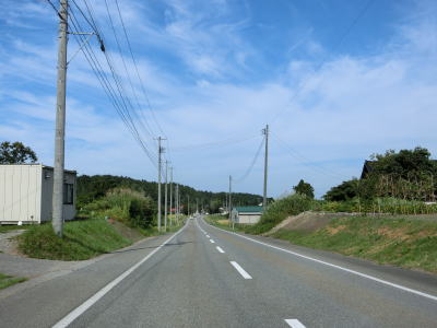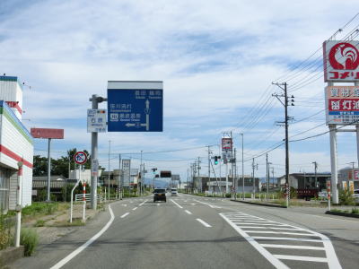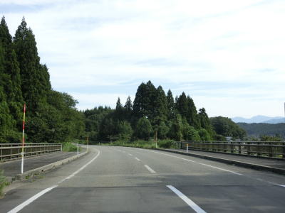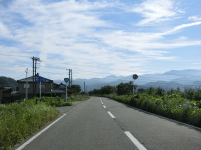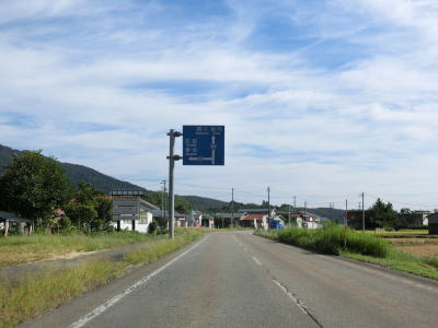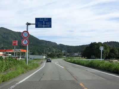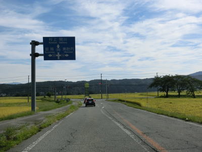 | 思案橋からは坂井川から少し離れて山裾を走っているが、勾配は非常に緩やかでカーブも少ないため走りやすいという点に変化はない。ごく緩やかな上り勾配の2車線道路を走っていると胎内市に入る。胎内市に入ってからも上り勾配が続いている。 | ||