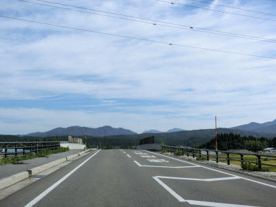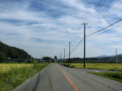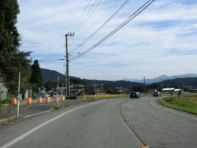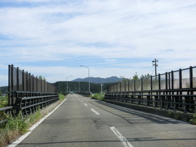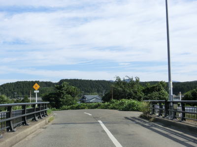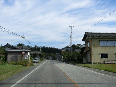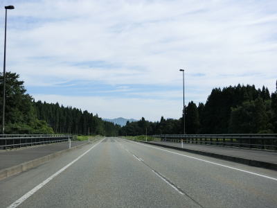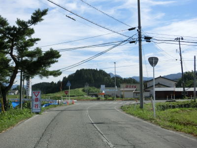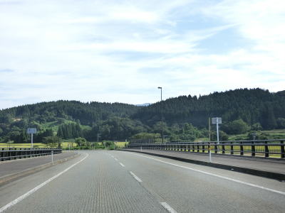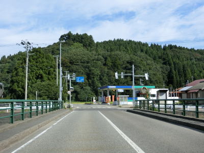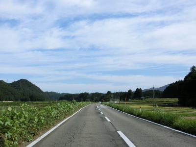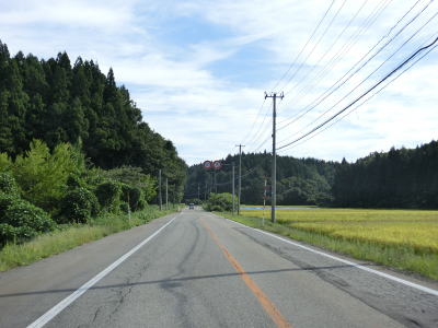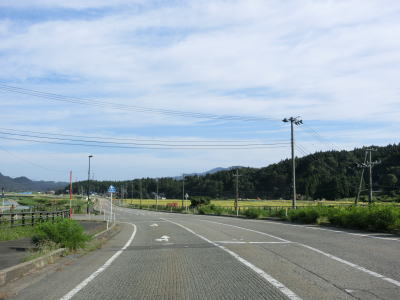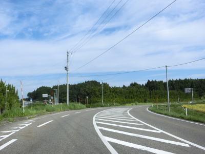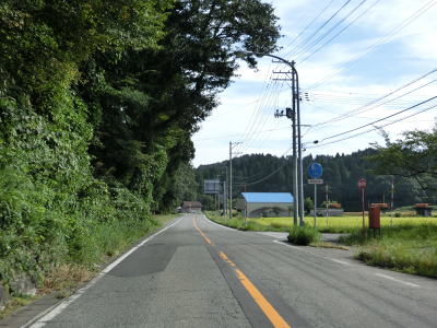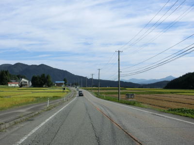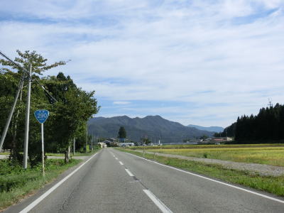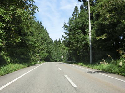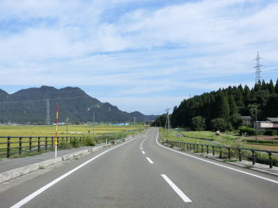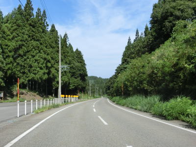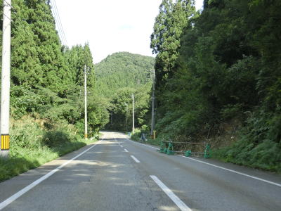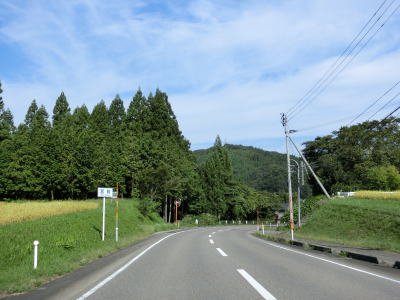 | 〆切交差点を過ぎて程なくして坂井川から離れて水田の間を走り抜ける。改良工事箇所を過ぎると集落が途切れて山が川に迫った場所を走る。そのような場所でも道路状況は良く走りやすい。 | ||