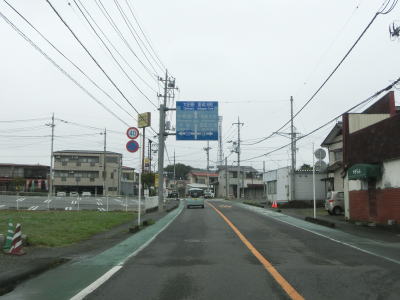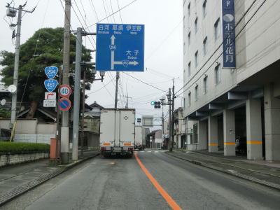 | 八溝交差点を過ぎてすぐに市町境を通過して那珂川町に入る。比較的走りやすい2車線道路を走っていると幅員減少の警戒標識が立っている。その先は確かに道幅は狭くなるが、センターライン付きの2車線道路は維持されている。 | ||