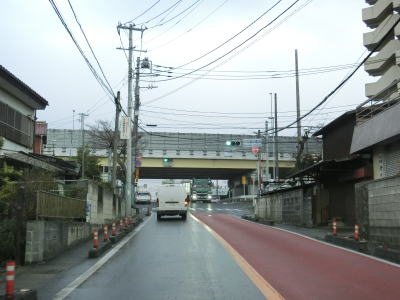 | 成田街道入口を左折した直後から右カーブを曲がりその途中の前原跨線橋でJR総武本線を越える。存在意義があるのかと問いたくなるような狭い歩道を備えた2車線道路をを走る。沿線には家屋が建ち並んでおり狭苦しさを感じる。千葉r135津田沼駅入口交差点を過ぎた先で新京成電鉄の前原3号踏切を通過する。 | ||