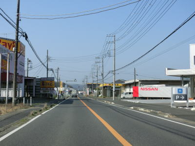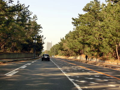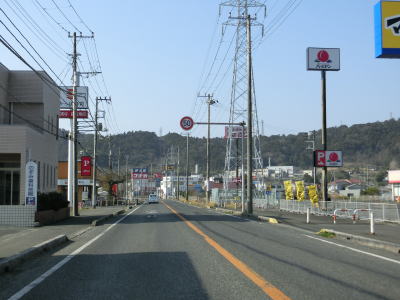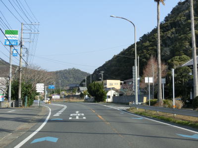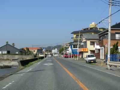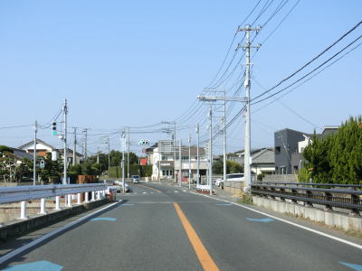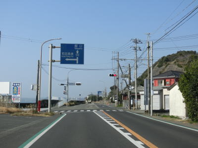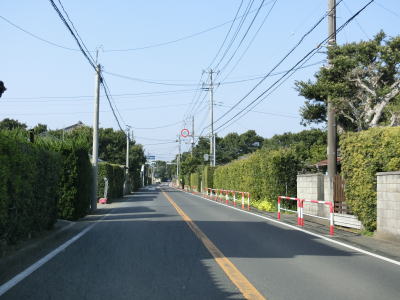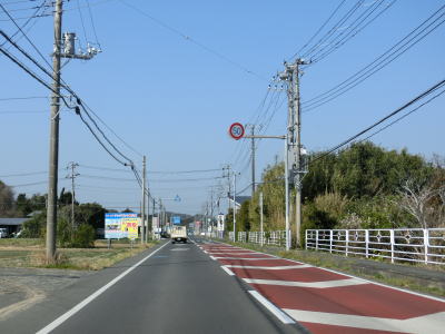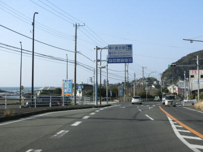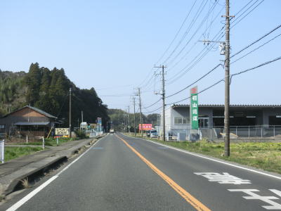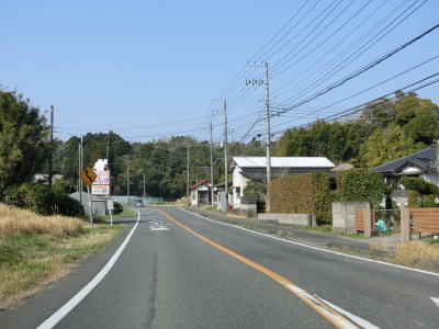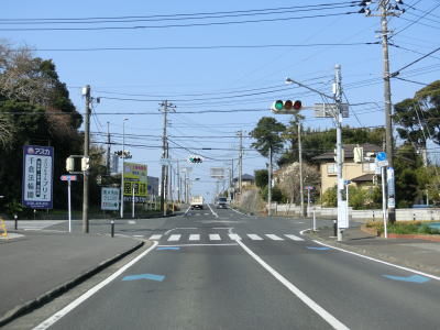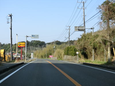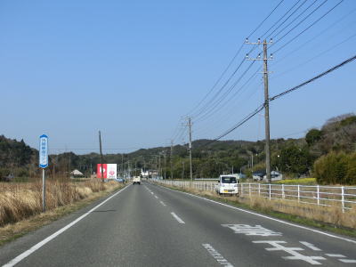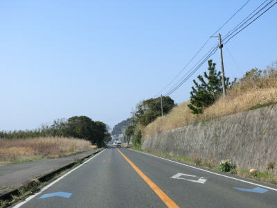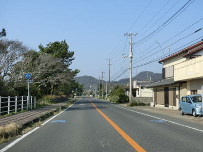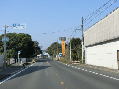 | 市境を越えて南房総市(旧和田町)に入ってからもほぼ平坦かつ直線的な2車線道路が続く。左(南)側は太平洋が広がっているが、防砂林で視界が遮られるせいで海は見えない。 | ||