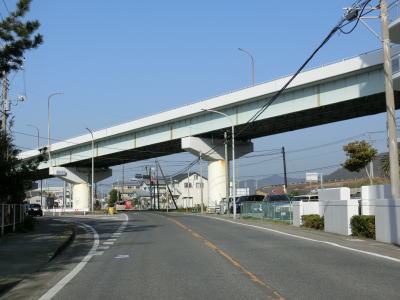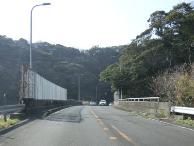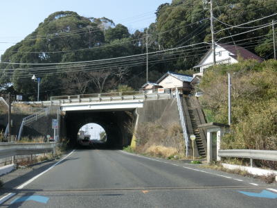 | 天面集落は海岸線に沿っており標高も低いため高波に注意するようにとの標識が設置されている。房州大橋を通るが、下にあるのは河川ではなく海である。その隣のJR内房線の山生橋梁は100年前の1924年(大正13年)に造られたものである。房州大橋を渡り終えると太夫崎隧道をくぐる。東側坑口の手前に架かっている太夫崎橋は旧道と思われる。 | ||