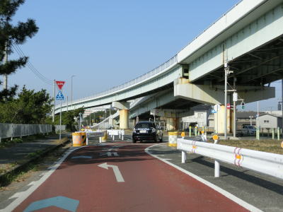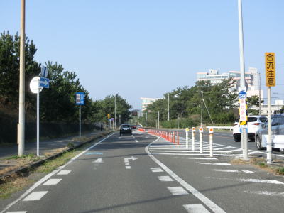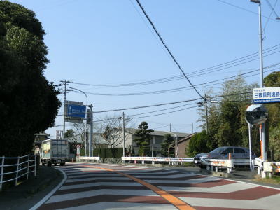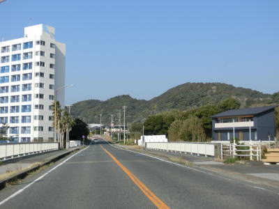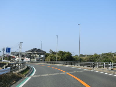 | 和田漁港入口交差点からは海とJR内房線の間を走る。勾配もカーブもほとんどなく見通しの良い2車線道路を快走できる。緩やかなS字状のカーブを曲がって旭橋を渡る。橋の前後に千葉r403が交差しているが、和田サーフ橋を含む方はバイパスと思われる。もっともr403は和田白浜館山自転車道線であり車両での通行はできない。 | ||