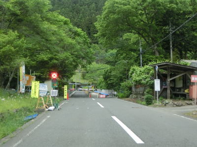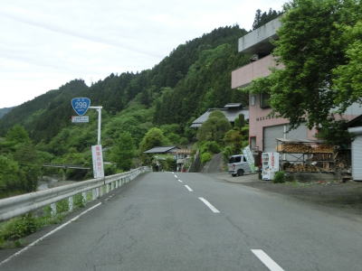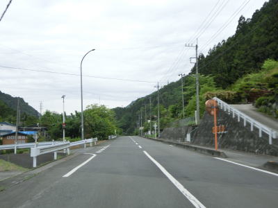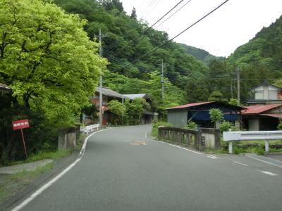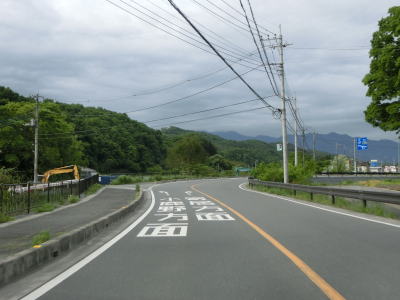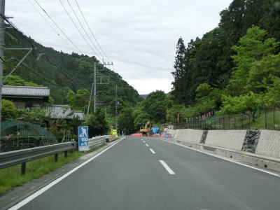 | 法師落人橋でセンターラインがなくなるが、走行した日は補修工事のため片側交互通行規制が敷かれており、センターラインの有無は確認できなかった。法師落人橋からは1.5車線幅狭路を走る。軍平集落の一部では拡幅工事が行われていた。 | ||