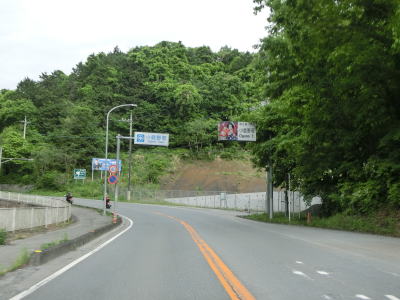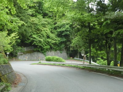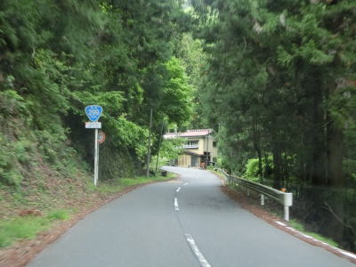 | 西秩父林道の交差点の手前に左のヘアピンカーブを曲がるが、その外側には1軒の民宿が建っている。その後も時折現れる急カーブを曲がりながら山岳道路を走る。等高線に沿っているため勾配はさほど急ではない。 右カーブを曲がって金山志賀坂林道との交差点の直後に志賀坂トンネルに入る。60年以上前の1960年に開通したトンネルであり、幅は若干狭く4.5mの制限高が設けられている。全長は247mで直線のため反対側の坑口まで見通す事ができる。 |