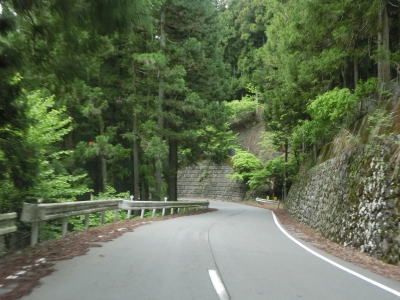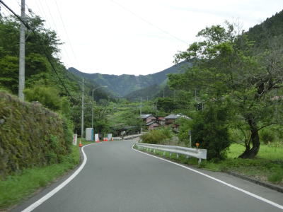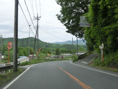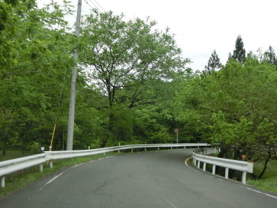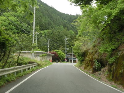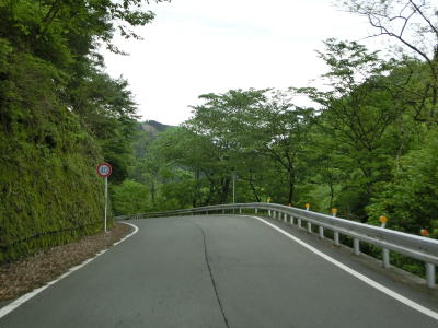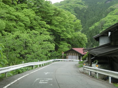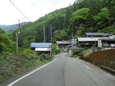 | 間物沢の源流付近で間物集落を通過するが、集落内にも連続ヘアピンカーブがある。ヘアピンカーブ以降は間物沢川に沿って下り、2つ目の瀬林集落を通り抜ける。道幅は1.5〜1.8車線幅と狭い。 | ||
