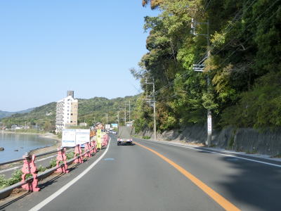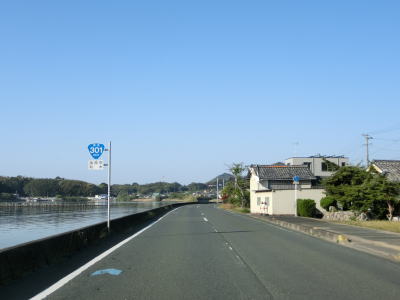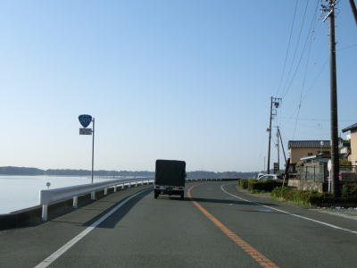 | 洲ノ鼻の根元を通り過ぎると松見ヶ浦沿いを走る。猪鼻湖と同様に出入口が狭いため湖面は穏やかな日が多い。松見ヶ浦の北西端で天竜浜名湖鉄道の下をくぐるが、かつては三ヶ日駅寄りの制限高3.0mの少し狭い場所を通っていた(以前の制限高は4.0mであったが、バイパス供用後に変更されたようである)。天竜浜名湖鉄道をくぐってすぐに静岡r4多米峠入口交差点を通過する。交差点の名称の由来となった多米峠を越えると愛知県豊橋市に行く事ができ、愛知県においてもr4の番号が与えられている。 | ||