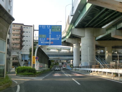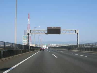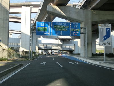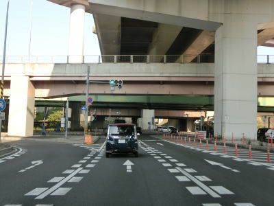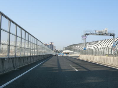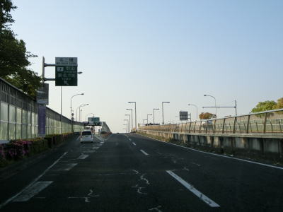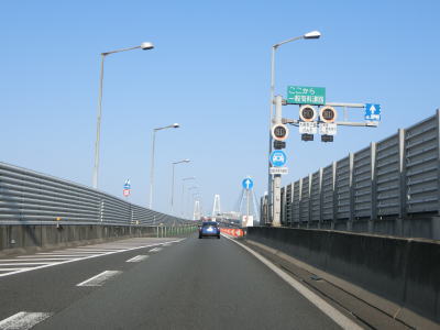 | 東海料金所を通過してランプを上った後に本線に合流する。合流する直前の本線に「ここから一般有料道路」という標識や自動車専用道路の標識、車種別の制限速度標識が立てられているのが確認できる。本線に合流すると片側3車線となり、程なくして名港東大橋を渡る。 | ||