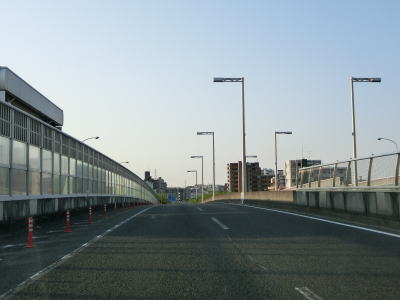 | 桜木大橋北交差点を右折すると片側3車線道路となるが、すぐに左端車線が減少して片側2車線の桜木小橋を渡る。桜木小橋を渡り終えると左側に車線が増えるが、これもすぐになくなってしまう。建設中のC2名古屋第二環状道の西側を走っていると右カーブを曲がって流出路と本線の高架の間を走る。 | ||