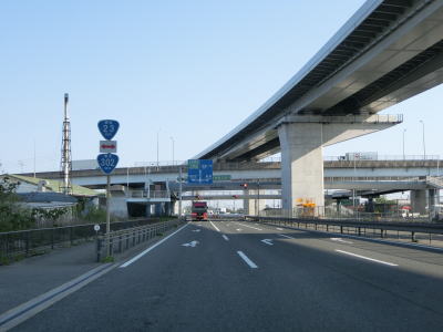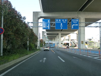 | 右側に車線が増えて片側3車線道路になると同時にE1A伊勢湾岸道の下から出て名和高架橋を通過する。高架橋の下にはR247の現道や名鉄常滑線がある。東海ICの料金所の脇を過ぎると下り勾配となり、インターチェンジの流出路が合流した直後にR247西知多産業道路との東海IC交差点を通過する。交差点に上には東海JCTがあり、E1A伊勢湾岸道と名古屋高速4号東海線とが接続している。 | ||