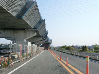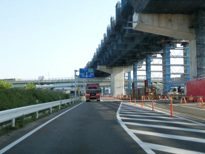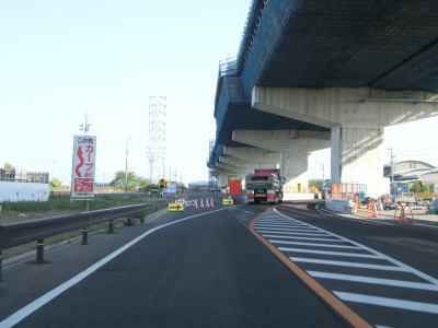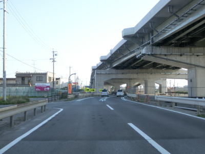 | 飛島大橋を渡り終えてからも建設中のC2名古屋第二環状道の西側を走る2車線道路が続いている。高速道路が建設されている事が関係しているのか分からないが、センターライン上にはラバーポールが設置されている。(仮称)南陽IC付近からは高架道路の下を通っているが、ラバーポールのある2車線道路という状態は変わらない。 | ||