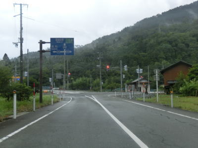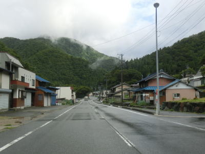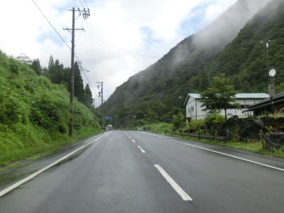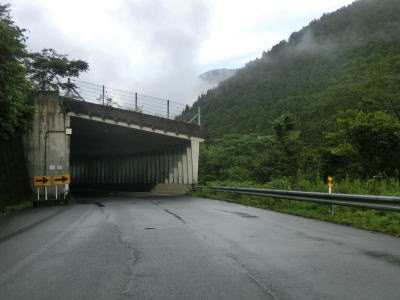 | 道の駅からも緩やかな上り勾配の2車線快走路が続いており、坂内広瀬集落を通過する。その後集落が途切れてから狭くなるという事もなく快走路が続いている。道路状況が良い割に交通量は極めて少ない。トンネルと橋梁が多く線形も改良されており、川に沿っている狭路が旧道であろう。。坂内広瀬集落以降の旧道沿線には家屋はほとんどないのだが、田畑があるようで閉鎖されていない区間もある。 | ||