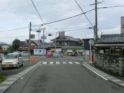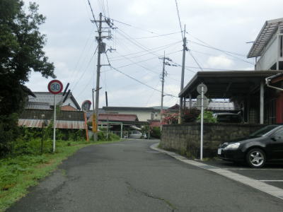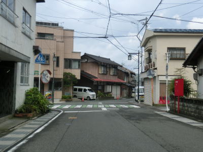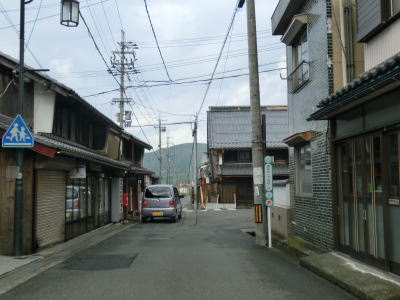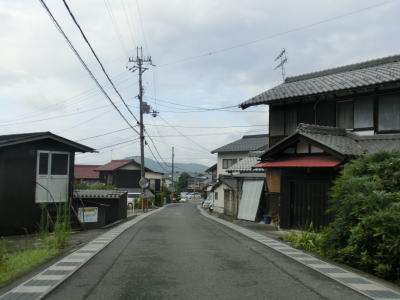 | 現道に進んでから約1.3km走ると集落に入る。狭くて薄暗い現道を走ってきたため単なる小集落に思えなくもないが、旧木之本町の中心部の東端に位置している。そのため沿線の家屋は多く拡幅もままならないのか1.5車線幅の狭路を走る。集落に入った直後の左カーブを道なりに通過し、直線道路を走っているとR365との東横町交差点を通過する。案内標識はなくソトバが設置されているだけである。さらにはソトバはトラックにでも当てられたのだろうか、向いている方向が実際の国道ルートを異なるので注意を要する。 | ||