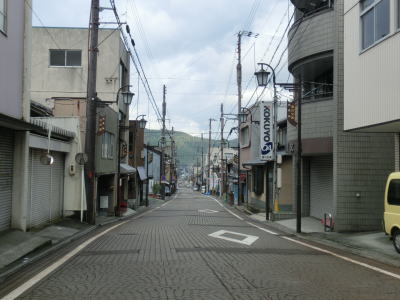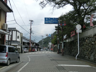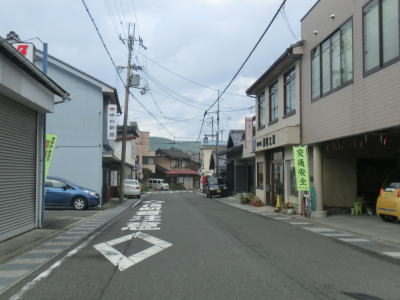 | T字路を右折してからは融雪水パイプがセンターライン代わりの2.0車線道路を走る。道路沿線の建物は店舗兼住宅が多く、かつては商店街であって事が窺える。約400m進み路面がアスファルトから石畳風になった所で市道との交差点を今度は左折する。案内標識は立っているもののおにぎりの表記がなく支柱に取り付けられたソトバが頼りである。 | ||