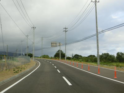 | 山岸第2交差点以南も片側2車線道路が続いているが、程なくして左側車線が減少して対面2車線道路に戻る。新保交差点からの距離は約3.3kmである。交通量が多い場所ではないため多車線の恩恵は殆ど感じられない。 | ||
