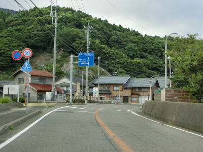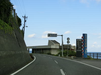 | 断崖の下を走っているとさらに一本木隧道と森腰隧道をくぐる。玉山隧道から森腰隧道にかけての4つのトンネルは1970年から1971年にかけて造られており、センターラインはあるものの車線幅がやや狭い。高波注意の警戒標識を通過して下った先で梅浦集落に差し掛かる。 | ||