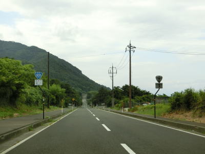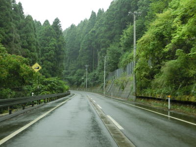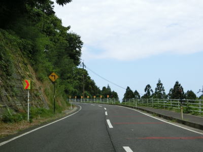 | 河野交差点からは海岸線から離れて上り勾配になった2車線道路を走る。潮見トンネルをくぐって河野川の流域を走っていると右の急カーブを曲がる。赤萩集落を通り抜けている町道との交差点を通過するが、この町道は旧道と思われる。 | ||