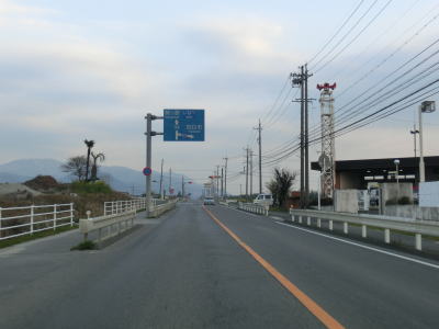 | 黄金大橋南交差点を左折しても2車線道路が続いている。左に大きくカーブしてから右にカーブするが、その後は集落が途切れて早くも閉鎖ゲートが現れる。これまで概ね平坦だったが、集落が途切れてからは上り勾配が続くようになる。センターラインがはっきり描かれた2車線道路だが、勾配がややきつくカーブが非常に多い。 | ||