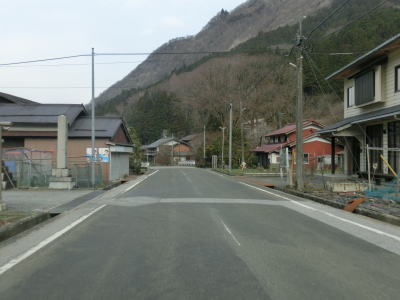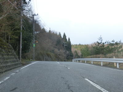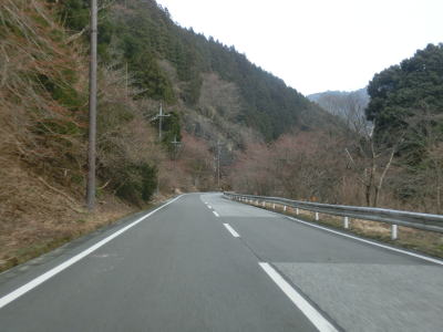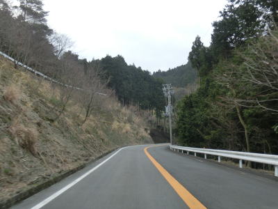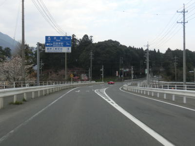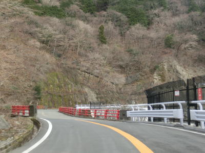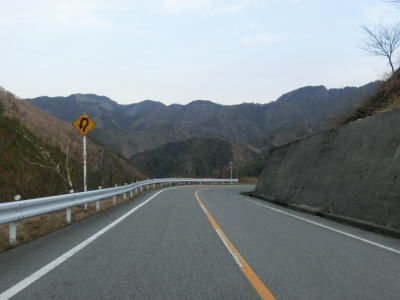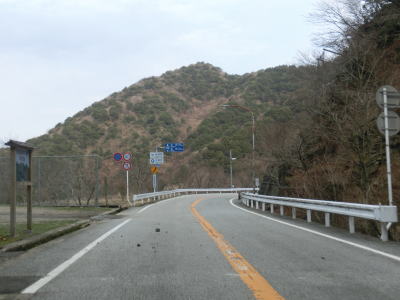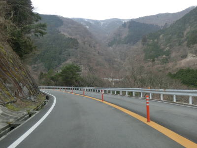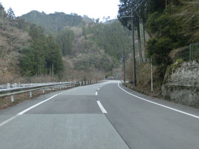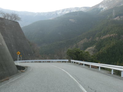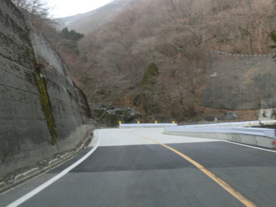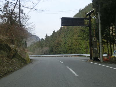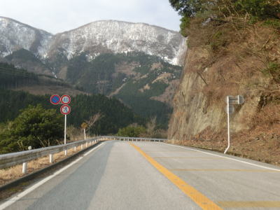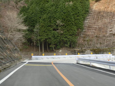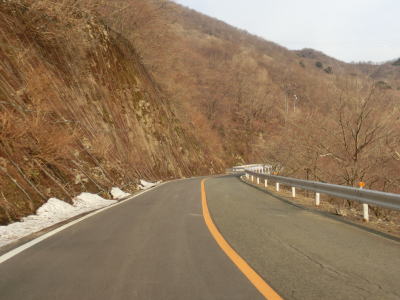 | 鞍掛峠区間はほぼ全てが2車線と整備されているにも関わらず、冬期閉鎖区間でありかつ落石や崩落等で通行止になる事が多い区間である。今回の走行の際にも前年に崩れた場所が2ヶ所あり、そこだけは舗装が白いコンクリート舗装となっていた。標高が600m近くになると路肩にまだ雪が残っているのが確認できた。東北や北陸の山間部(特に高所)では3月末の残雪は珍しくも何ともないのだろうが、近畿地方においては3月の雪というのは珍しい。 | ||