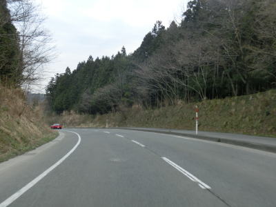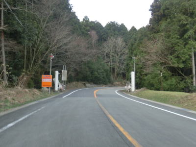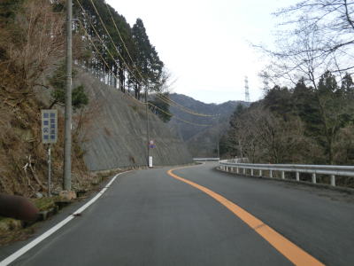 | 急なカーブには段差減速帯やラバーポールが設置されている箇所もいくつかある。県境の峠に向かっているため上り勾配が長く続いているが、登坂車線は一切設置されていない。カーブが多く追越しできないため、足の遅い車両が前にいればストレスの溜まる走行を強いられる可能性が高い。 | ||
