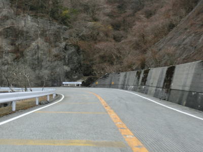| 鞍掛峠区間の滋賀県側は勾配に限れば三重県側に比べると緩やかだが、カーブの多さは同程度である。カーブ部分のセンターラインには車線逸脱防止のために道路鋲が埋め込まれているはずなのだが、その多くが欠損している。タイヤ痕からも想像できる通り、その原因は意図的に車線を跨いで走る車両によるものであろう。集落から離れた交通量の少ない山間部とあって、夜な夜なその手の方々が出没しているようだ。冬期閉鎖される峠道ではあるが、三重県側同様に2車線道路となっている。 | ||