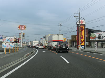 | 彦根ICから緩やかで短い勾配を下ってから平坦になるとR8・R307・滋賀r25との外町交差点に至る。彦根市の市街地からは離れた位置にあるが、一桁幹線国道との交差点とあって周囲には商業施設が目立つ。そのため昼間であれば交差点を先頭に流れが悪くなる事が多い。 | ||