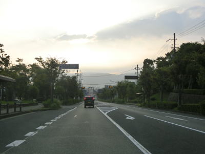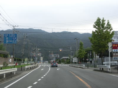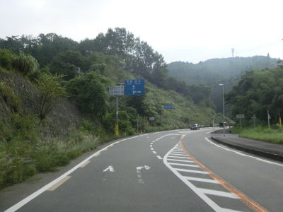 | 裏白トンネルを出て少し走ると旧道との交差点を通過する。京田辺方面は簡易的なバリケードによって閉鎖されているが、南方向は木津・奈良方面に抜ける道路と繋がっているため通行可能である。 緩やかな勾配を上りながら右カーブを曲がっているとR422下朝宮交差点を通過する。裏白峠から約2.5kmである。案内標識に表記されていないが、ここから伊賀・水口方面はR422が重複している。 |