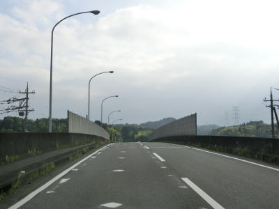 | 中畑交差点を過ぎてからもしばらくは上り勾配が続いている。下りに転じた後に滋賀r540交差点を通過するが、右折車線が設置されており案内標識もあるがヘキサは表記されておらず県道との交差点には見え難い。r540交差点からは緩やかな上り勾配となる。道路の両側をフェンスで挟まれた場所を通過するが、有料道路だった頃に料金所が置かれていた場所である。2010年10月5日に無料開放された後に料金所は撤去されている。 料金所跡からも2車線道路が続いており、程なくして市町境を通過して日野町に入る。市町境の上に跨道橋が架かっていたが撤去されていた。ストリートビューで確認すると2019年4月にはまだ残っていたが、2021年3月にはなくなっていた。航空写真を見ても跨道橋の前後に道路が確認できない事から不要と判断されて撤去されたのだろうか。 |