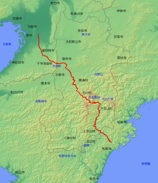 | 主な経由地 | 三重県熊野市〜 〜奈良県下北山村〜上北山村〜大淀町〜御所市〜 〜大阪府富田林市〜松原市〜大阪市 |