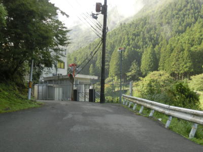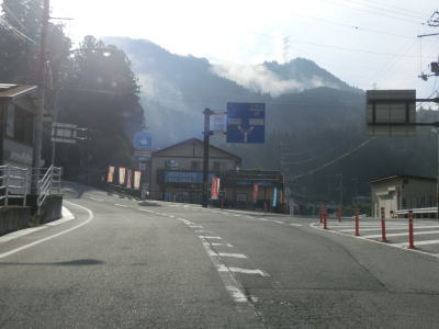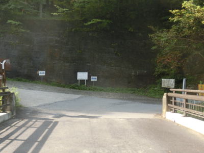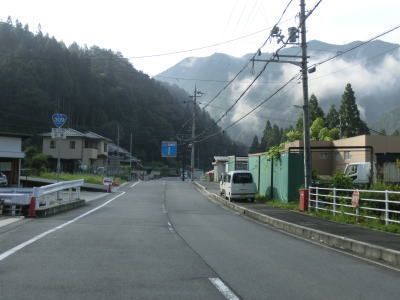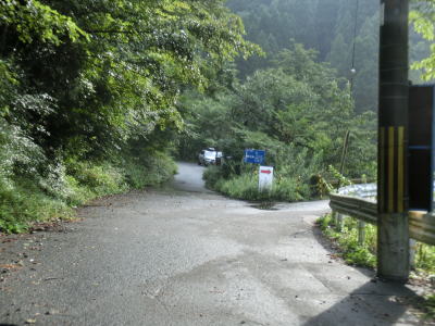 | 鬱蒼と生い茂る杉林の中を少し走ると景色が開けるが、道幅は1.5車線と狭い。川迫川に沿って走っていると川合発電所を通過して北角集落の川寄りを通過する。集落には天川村漁業組合があるのだが2015年9月頃に村役場付近に移転するようだ。釣りをしない筆者にはどうでもよい情報ではある。北角集落の東端には大型車の通行を制限する看板が立てられているが、それによると高さ3m以上、長さ7m以上の車両が通行不可とされている。 | ||
