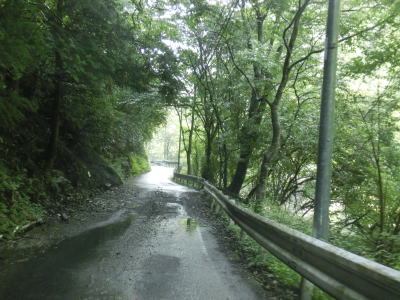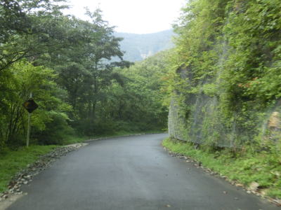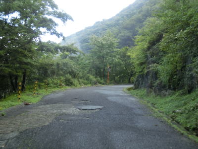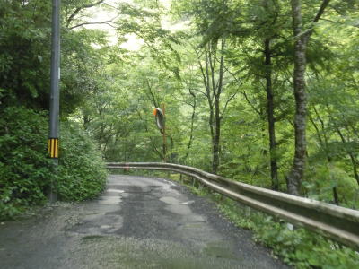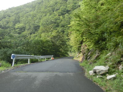 | 標高900m付近からは道幅が若干広くなって1.5〜1.8車線幅になる。落石が多い上り勾配であるという点に変化はない。橋の前後で段差が生じているとは書いたが、それ意外にも道路を横切る溝も段差になってしまっている。グレーチングで蓋をされている溝や鉄を埋め込んでスリットに水を流している箇所もある、車なら問題ないだろうがバイクや自転車はスリップに注意が必要となる。 | ||