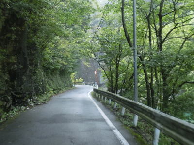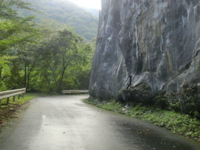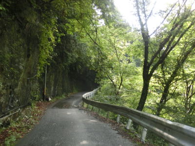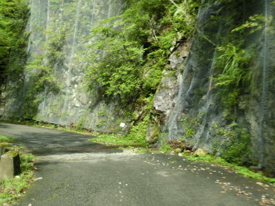 | 等高線沿いを走っていると右にカーブして進行方角を南東に変えて小坪谷川の左岸の斜面を走る。標高は1000mを越えており山岳らしい風景となっている。法面は落石防止処理がされている箇所も多いが、落石防止ネットの下部に引っかかっているのが剥がれたモルタルというあまり笑えない状態となっている。また、通常落盤によって谷側の路面が欠損している事はよくあるが、この行者還区間においては流出する水の勢いのせいか山側に穴が開いている事がある。 | ||