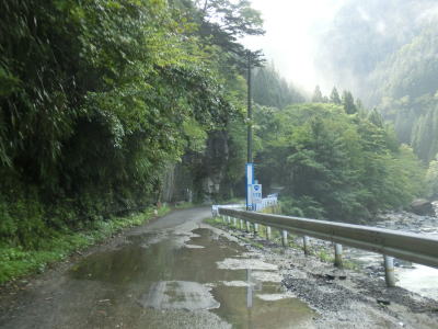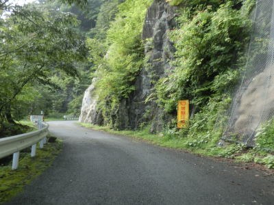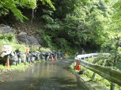 | 随分奥に来たものの相変わらず隣を流れる川迫川との高低差は小さい。これまでも路面状況や法面の小崩落は何ヶ所もあったが、キャンプ場以降はその規模が少々大きくなっており、崩落に対しては巨大土嚢が置かれている場所も複数ある。 | ||