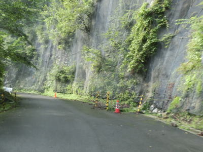 | 185.「落盤注意」 | 186.剥がれたモルタルが落石防止ネットに引っかかっている | 187.谷側ではなく山側の路面に穴 |