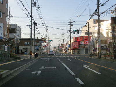 | 下り勾配が終わって平坦になって少し進むむとR170原町北交差点を通過する。R170は大阪外環状線と呼ばれる幹線国道で、交差点上を片側2車線の跨線橋でパスしている。案内標識ではR371橋本が右折側に表記されているが、そちらはバイパスでありR371現道に向かうには直進しなければならない。 原町北交差点からも対面2車線道路が続いているが、沿線に家屋が密集しており交通量が多い事もあって狭苦しく感じられる。市道との本多町交差点付近から下り勾配となり、原町北交差点から約800mでR170・R371本町七つ辻交差点に至る。R310は左折して羽曳野方面のR170に重複する。なお、ここで交差しているR170、R371ともに現道であり、R371はこの交差点が起点である。 |