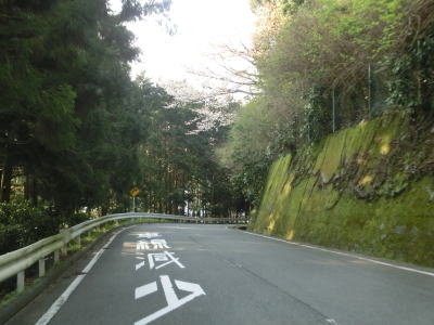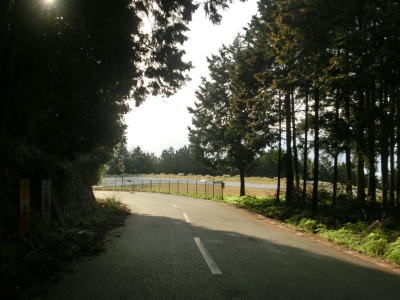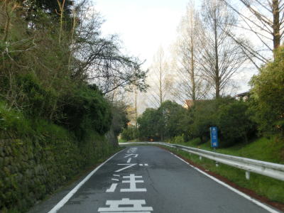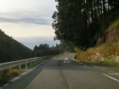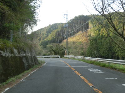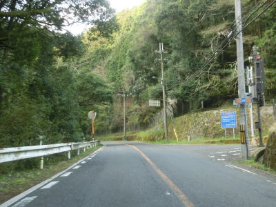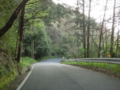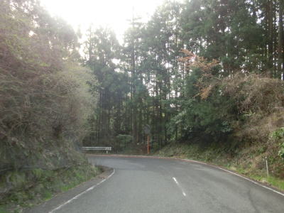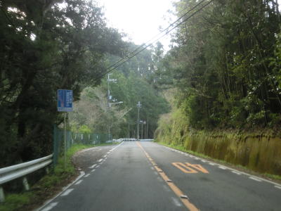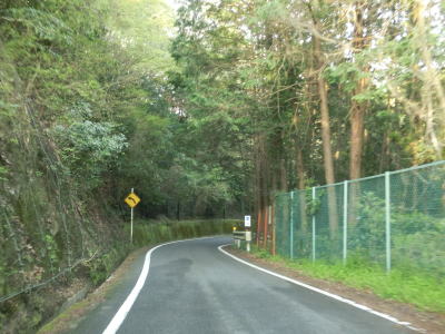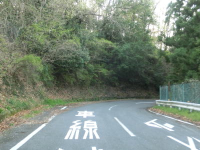 | 等高線に沿った緩やかな下り勾配を走っていると広場のような場所の前を通る。道路との間にフェンスがあり出入口には鎖が張られている広場にはヘリポートが設置されている。周囲には病院どころか人家もない場所なので、災害時に使われるヘリポートかもしれない。ヘリポートを過ぎると鬱蒼とした場所を走る。センターラインがはっきり見えるものの路肩には落ち葉が堆積しており実用的は道幅は通常の2車線道路よりも狭くなっている。 | ||