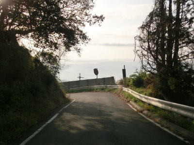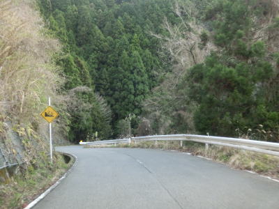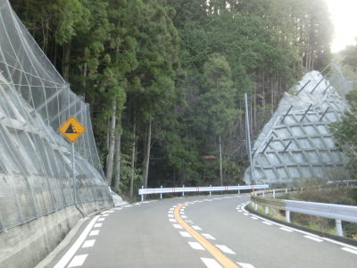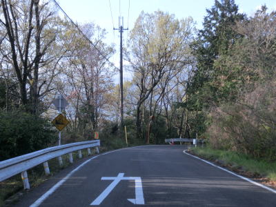 | 養鶏場(?)付近で景色が開けて明るくなる。市道との交差点を交差点を過ぎてしばらくは勾配は緩やかだがカーブの多い状況を走る。下り10%の警戒標識を過ぎると右にカーブして急勾配を下ると言いたいところだが勾配は10%もあるようには見えない。急勾配区間から道幅は1.5車線と狭くなる。谷側にはガードレールに加えてフェンスが設置されているが、おそらく不法投棄対策と思われる。 | ||